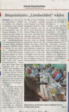 Klick auf das Bild öffnet die Pressemitteilung)Mannheimer Morgen: "Der Güterzugverkehr durch Mannheim wird in den kommenden Jahren erheblich zunehmen. In diesem Zusammenhang fordert jetzt die CDU im Gemeinderat erneut "maximalen Lärmschutz für die Bevölkerung." Das müsse "oberstes Ziel" sein, formulierten die Christdemokraten Bedingungen für eine Trassenführung durch Mannheim - und fordern eine Machbarkeitsstudie zur Untertunnelung der künftigen Güterzugstrecken auf der Riedbahn." Der CDU Fraktionschef Carsten Südmersen gegenüber dem Mannheimer Morgen: "Es müssen alle Möglichkeiten geprüft werden, die eine Durchfahrung Mannheims mit Güterzügen erträglich machen. Wir fordern klare Bedingungen für eine Trassenführung. Wir können es uns nicht leisten, den Wohn- und Lebensstandort nachhaltig durch Güterzüge, die durch unsere Vorgärten rauschen, zu beschädigen. Wir erwarten, dass in Mannheim mindestens die Maßstäbe angesetzt werden, die zu einer Tunnellösung in Rastatt und Offenburg geführt haben. Lärmschutz ist ein Grundbedürfnis, das die Bürger zu Recht einfordern. Hierbei darf es keine Denkverbote geben." Zum Artikel aus dem Morgenweb (pdf) 9/2015: BILA Lampertheim: "Im gleichen Boot" Der Mannheimer Morgen berichtet, wie weit man in Lampertheim denkt und wie die Zusammenarbeit der Bürgerinitiativen für die Interessen der Region langsam gedeiht. "Im weiteren Schritt käme es darauf an zu prüfen, inwieweit die Bahn mit Blick auf die fulminante Belastung durch eine Zunahme der Güterzüge dazu bereit wäre, die Gestaltung der Neubautrasse zu überdenken. Etwa mit dem parallelen Ausbau einer ICE- und einer Güterverkehrsstrecke." (Aussage von Bila-Sprecher Ulrich Guldner im Mannheimer Morgen). "Damit könnten die Schnellzüge auf einer Konsenstrasse in den Mannheimer Hauptbahnhof geleitet werden, die Güterzüge hingegen auf direktem Weg zum Güterbahnhof. Hierdurch hätte die Bevölkerung Lampertheims und Mannheims den befürchteten Güterverkehr vom Hals." (Aussage von Bila-Sprecher Ulrich Guldner im Mannheimer Morgen). "Zumindest in diesem Schreckensszenario sehen sich Lampertheimer wie Mannheimer im gleichen Boot respektive Zug sitzen. Hier wollen die Bürgerinitiativen nördlich von Mannheim auch ansetzen, um die Konsenstrasse wieder "aus der Schublade" zu ziehen. Der Sprecher der Lampertheimer Bürgerinitiative "Lebensraum vor ICE-Trasse" (Bila), Ulrich Guldner, sieht diesbezüglich ein "Pflänzchen" wachsen, das es behutsam zu pflegen gelte." So ist es! Vielen Dank an Herrn Guldner und den Mannheimer Morgen für diesen wichtigen Beitrag! Artikel aus dem Morgenweb (pdf) 9/2015: Vortrag mit Diskussion in Neuostheim ein schöner Erfolg Die Veranstaltung des Stadtteilvereins fand guten Anklang. Besonders erfreulich ist, dass der Stadtteilverein Neuostheim e.V. ein neues Mitglied von GESBIM ist. Wir begrüßen den Stadtteilverein und freuen uns sehr! 9/2015: ![]() Neue Bürgerinitiative in Neuhermsheim gegründet - Neues Mitglied von GESBIM Die Menschen in Neuhermsheim kennen sich sowohl mit Bahnlärm, als auch mit der Wirkung bzw. Nicht-Wirkung von Lärmschutzmaßnahmen gut aus. Wir freuen uns sehr, dass die Neuhermsheimer mit der BI NoBl einen Ansprechpartner vor Ort haben. Und dass die BI NoBl ein neues Mitglied von GESBIM ist! PS: Wenn Sie Kontakt mit der BI NoBl wünschen: Ansprechpartner ist Herr Albert Bühler, Telefon: 0621-9783046, E-Mail: albert.buehler@buehler-consult.de 9/2015: Nordnachrichten: guter Artikel, guter Kommentar Die Nordnachrichten berichten ausführlich auf Seite 1. Sehr lesenswert ist auch der Kommentar von Herrn Schillinger "Noch mehr Bahnlärm macht Menschen krank!" auf Seite 4. Wir werden den Kontakt mit Herrn Schillinger suchen! Link zu den Nordnachrichten (Format: pdf). 9/2015: Die Region vernetzt sich: Projekt "Rhein-Neckar 21" GESBIM hat in den vergangenen Wochen viele Gespräche mit Bürgerintiativen und Politikern in der Region Rhein-Neckar geführt. Dies erfolgte auch vor dem Hintergrund der Erfahrungen, die die Bürgerinitiativen am Oberrhein (IG BOHR) gemacht haben. Wir bedanken uns ganz herzlich bei Herrn Diehl von der IG BOHR für die guten Gespräche und wertvollen Hinweise. Die IG BOHR hat für Offenburg den Tunnel erreicht - es ist großartig, dass wir von diesen Erfahrungen profitieren können. Unsere Kolleginnen und Kollegen in Hockenheim, die Bürgerinitiative BISS (BürgerInitiative Stille Schiene Hockenheim e.V.) haben sich hierzu bereits in der Presse geäußert, siehe Morgenweb. Auszug aus dem Artikel: "Doch nun bewege sich etwas. Angeregt von der Bürgerinitiative "Gesundheit statt Bahnlärm in Mannheim (GESBIM)" würden erste Gespräche vorbereitet mit der Zielsetzung, ein Projekt "Rhein-Neckar 21" sowie einen Projektbeirat nach badischem Muster aufzusetzen. Sowohl der Landrat des Kreises Bergstraße, Matthias Wilkes, als auch die Deutsche Bahn AG hätten signalisiert, dass sie die Einrichtung eines solchen Projektbeirats unterstützen würden. "Wir sehen darin zunächst eine große Chance, dass von der Politik mittelfristig zusätzliche Mittel für eine menschenverträgliche Lösung der Bahnlärmproblematik entlang der geplanten Strecke Frankfurt-Mannheim, in Mannheim selbst, aber natürlich auch für eine nachhaltige Verbesserung der Situation in Hockenheim bereitgestellt werden", sagt Konrad Sommer. Die vorbereitenden Gespräche werden nach der Sommerpause aufgenommen." 9/2015: Großer Erfolg der Petition - das Unterschriftensammeln geht aber natürlich weiter! Die Unterschriftensammlung bei openPetition ist abgeschlossen. Damit die Petition als Erfolg gewertet wird, muss ein Quorum erreicht werden, welches anhand der Bevölkerungszahl ermittelt wird. Für Mannheim sind 3.100 Unterschriften vorgegeben. Wir haben in Mannheim über 4.200 Unterschriften gesammelt. Natürlich sammeln wir weiter - klicken Sie auf Unterschreiben, wenn Sie uns unterstützen wollen! Bei allen Unterstützern wollen wir uns an d